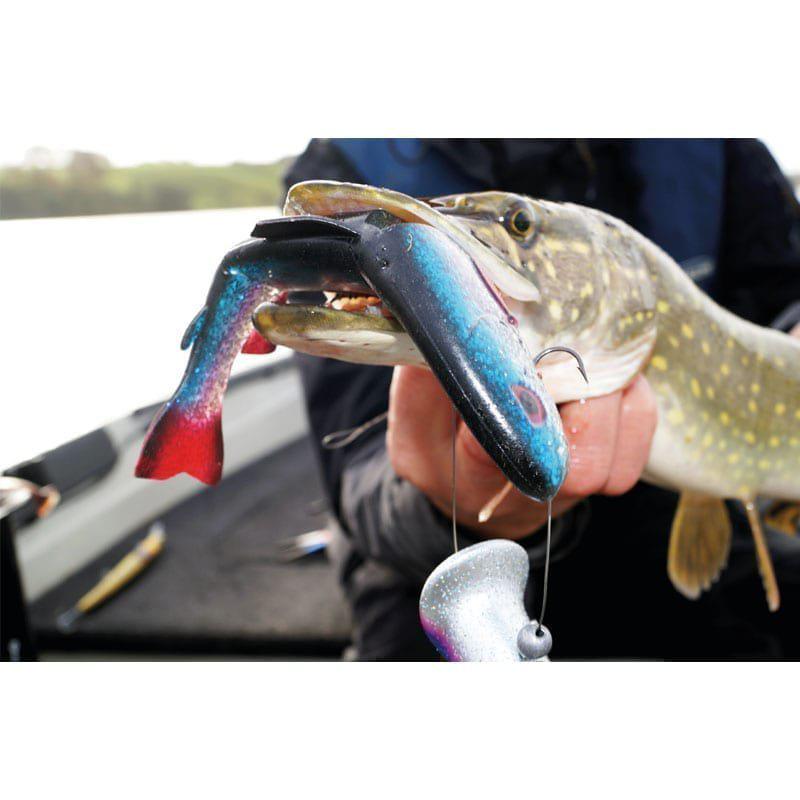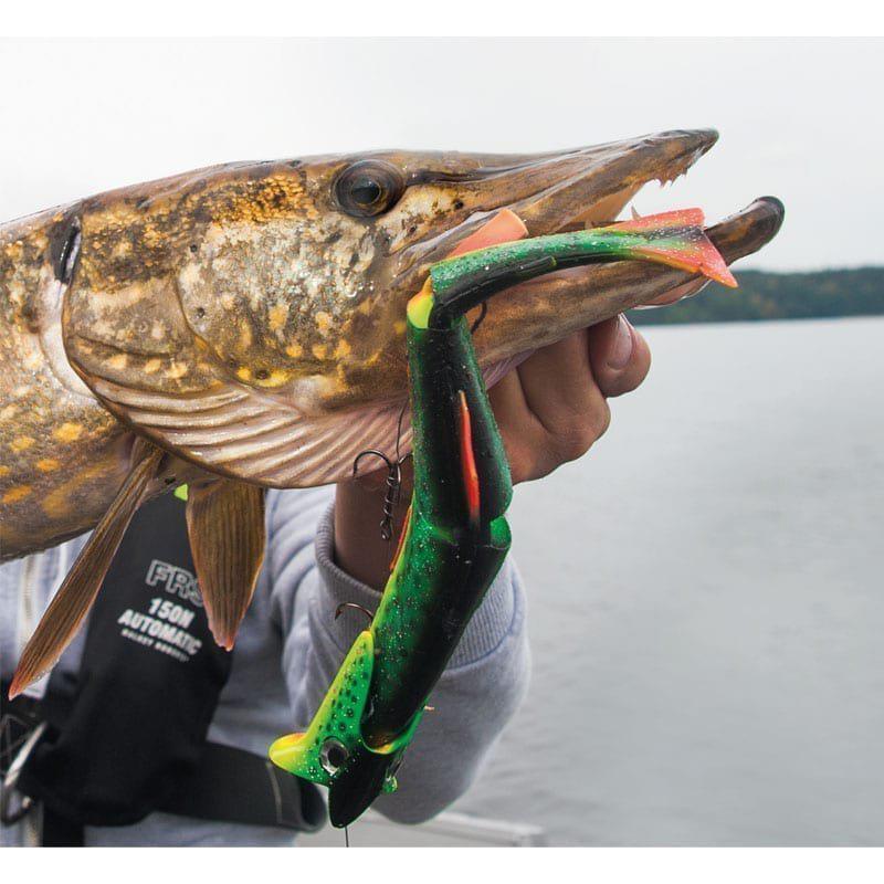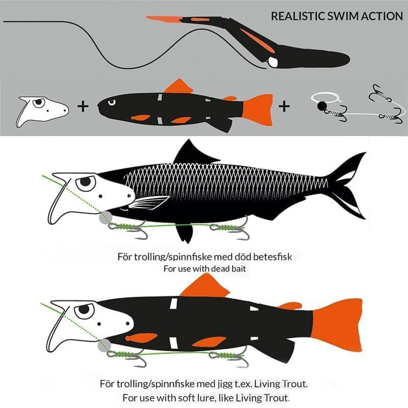 Living Trout is a swimbait, a soft lure which imitates a fish both in swimming action and shape. The streamline-shaped and segmented body gives Living Trout a highly realistic action. You can Fish Living Trout with a shallow screw rig. In our range there are several different rigs which match perfectly. Without extra weight you can fish Living Trout very shallowly and down to 6-7 feet. If you want to fish deeper you simply attach a Fladen Quick-change-weight. Living Trout is specially designed for Faceit, a baitholder made by Fladen. Both shape and colours match perfectly with Faceit. Faceit enhances the movements in Living Trout. A deadly combo for both ordinary spinning and trolling!