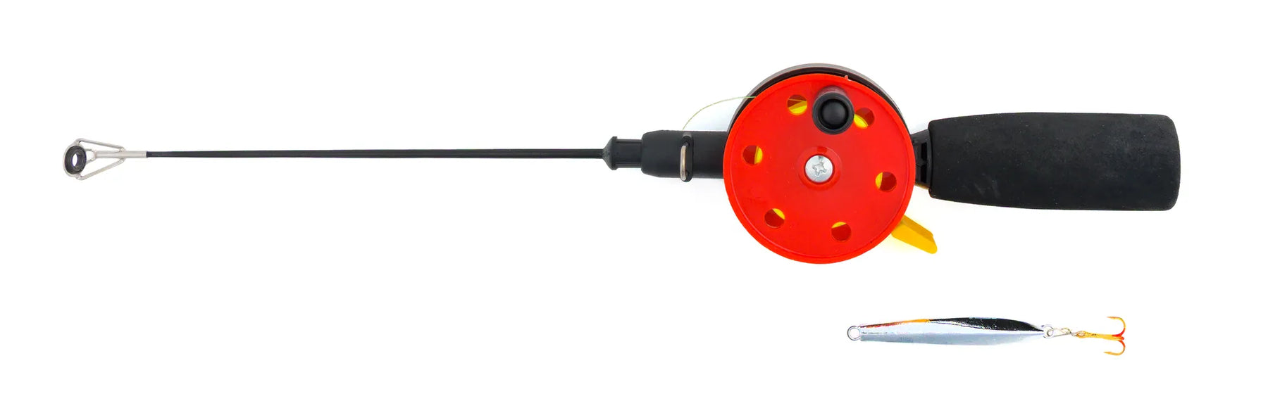 Pimpelset Mini. Spö på 30cm, med 30m påspolad lina i 0.20mm. Inklusive 1st vertikalpirk.